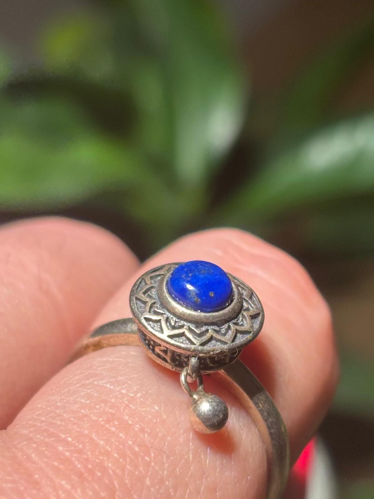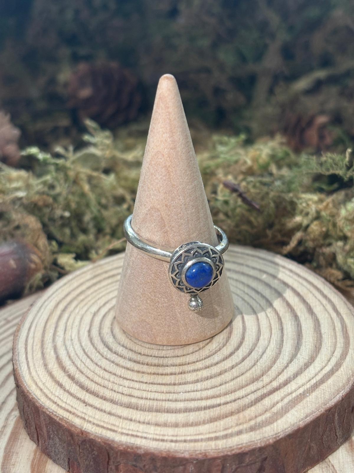 Son cabochon de lapis lazuli, d’un bleu profond, est serti sur un socle tournant. Tu peux le faire pivoter du bout des doigts : un mouvement discret et apaisant, parfait pour calmer l’esprit et évacuer les tensions.