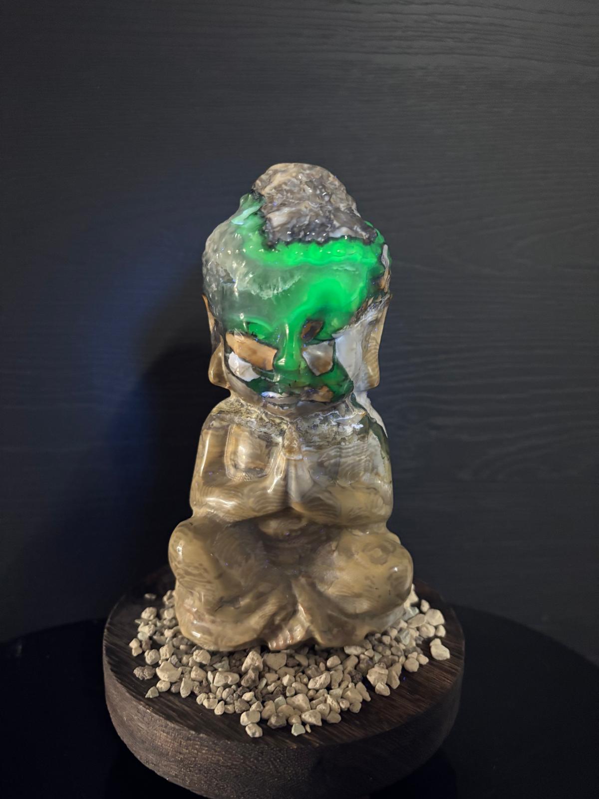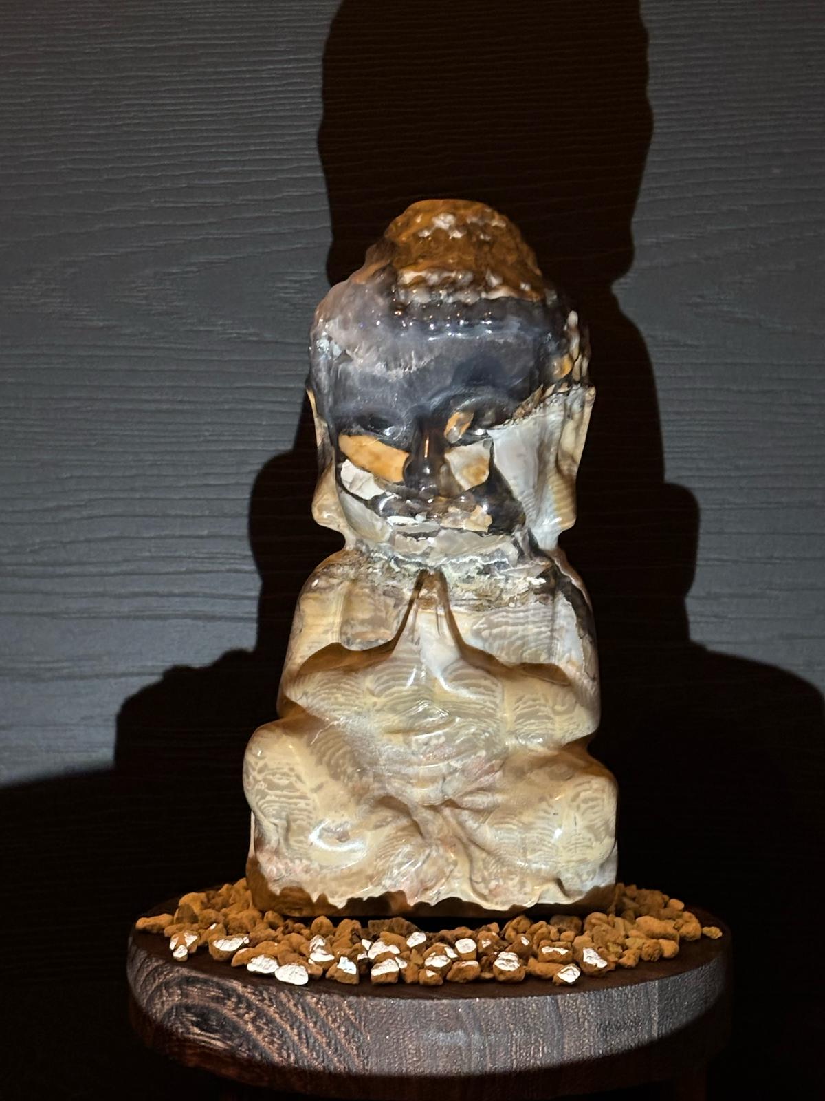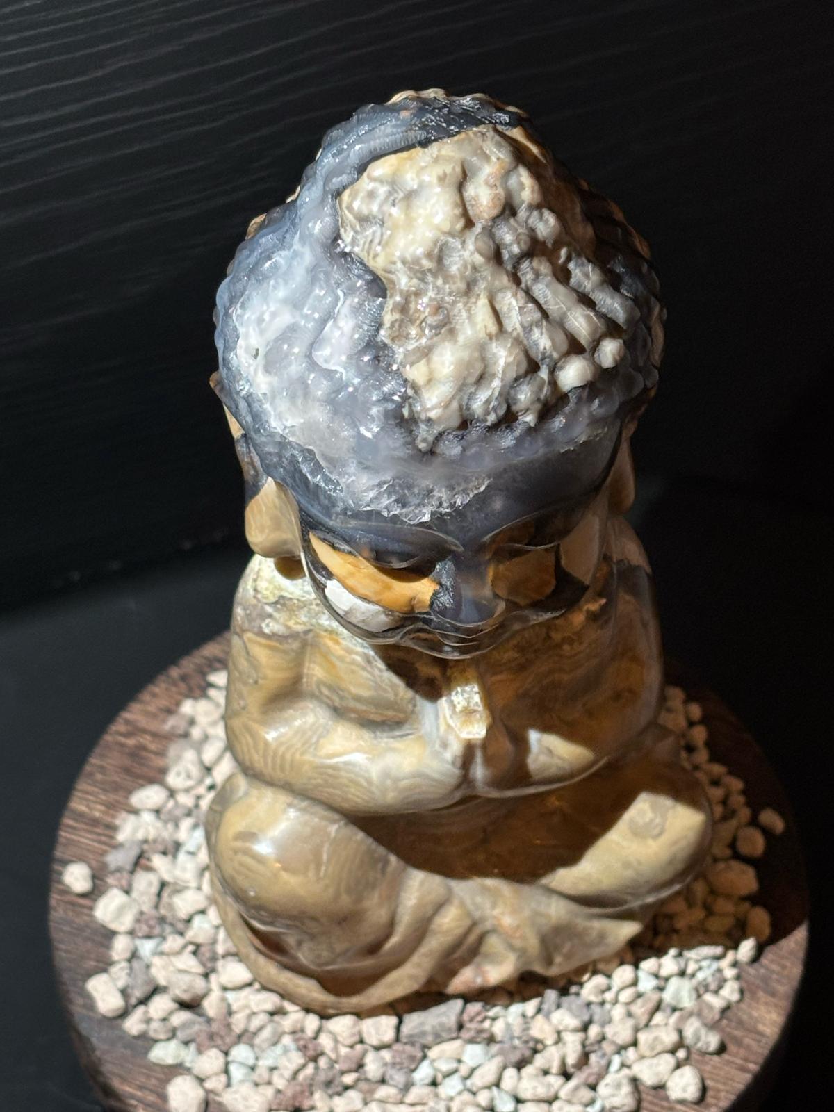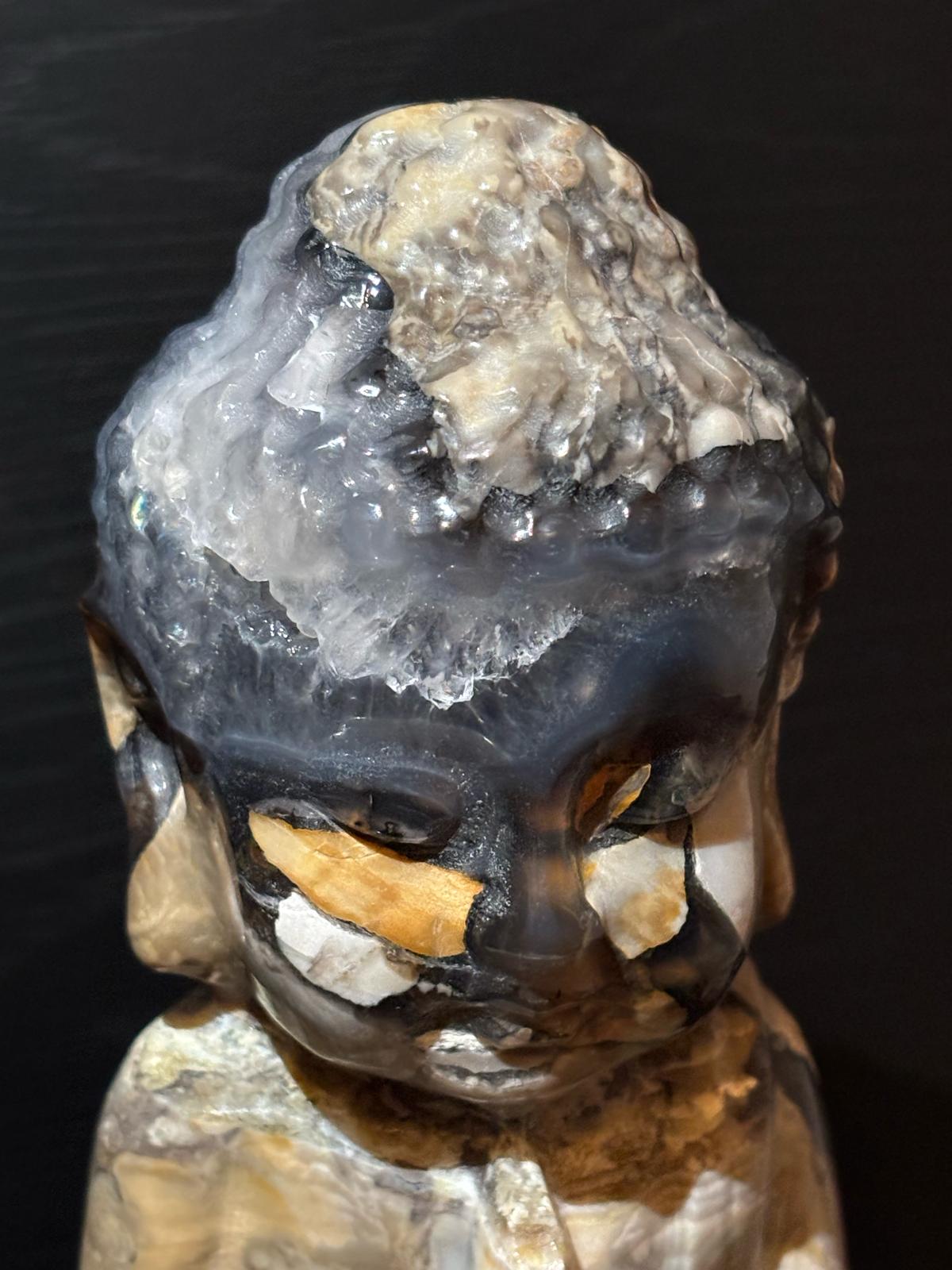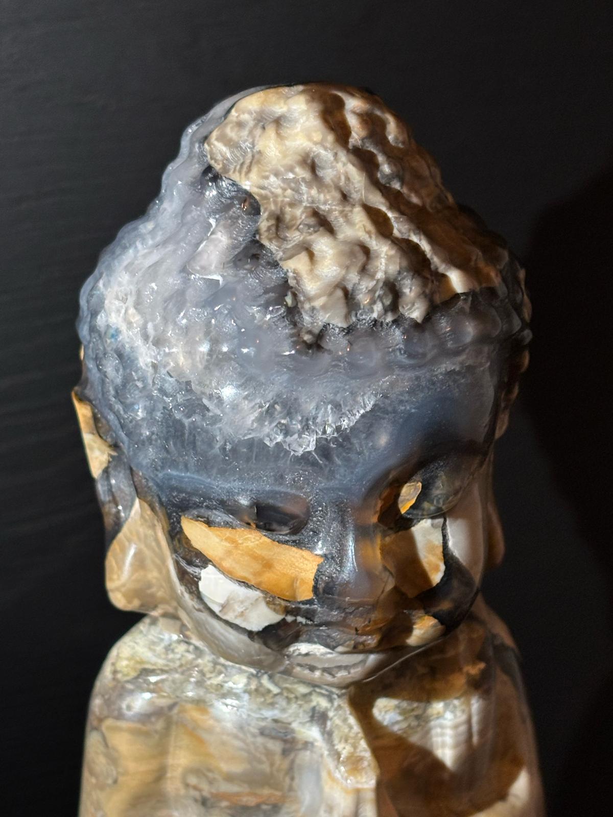 Un Bouddha énigmatique, sculpté dans l’Agate Volcanique, couronné d’un Crâne Druzy scintillant. 🌑💀