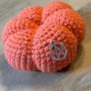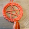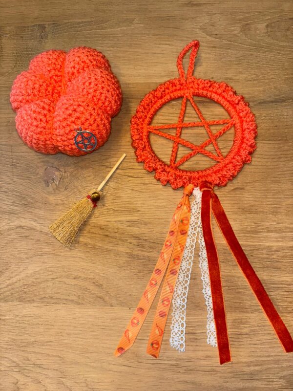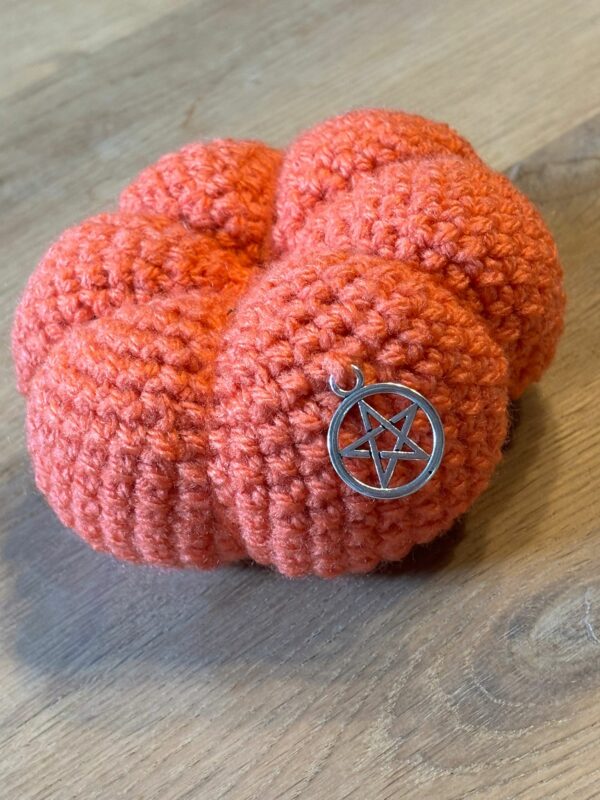 Une citrouille crochetée couleur orange flamboyant, décorée d’un pendentif pentacle argenté, symbole de protection et de magie.