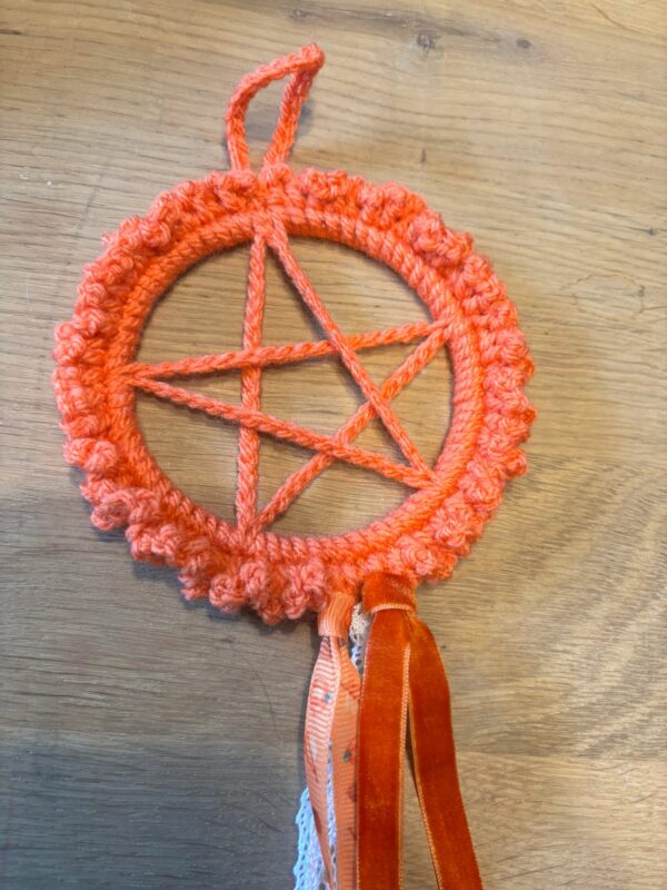 Un pentacle crocheté décoratif, entouré de rubans (velours, dentelle et motifs citrouilles) pour apporter une touche mystique et festive à ton intérieur.
