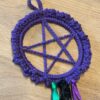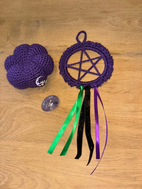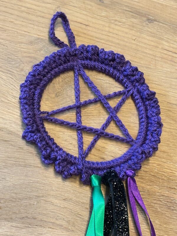 Un pentacle crocheté décoratif, entouré de rubans violets, verts et noirs pailletés, pour une ambiance à la fois mystique et féérique.