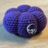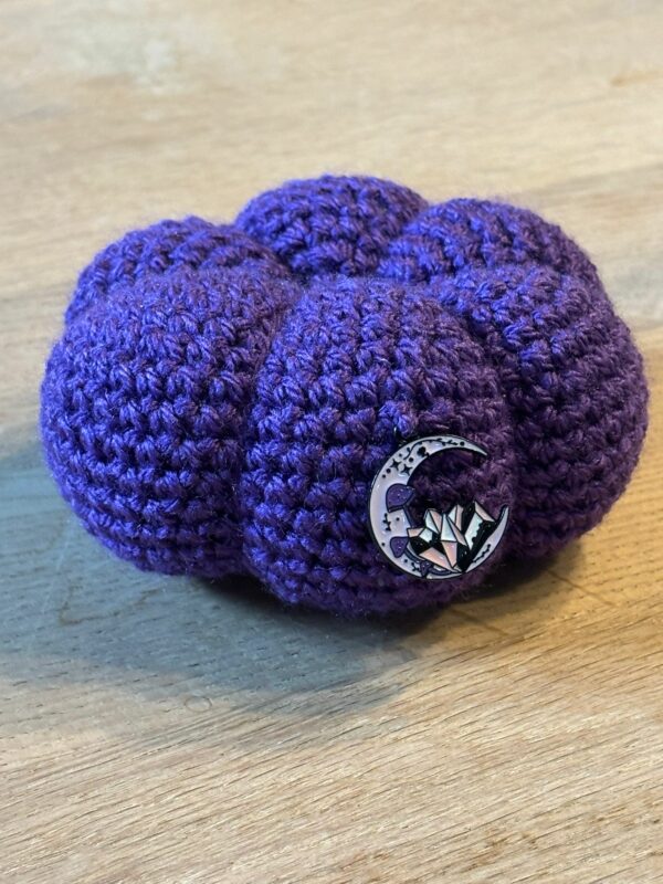 Une citrouille crochetée couleur violet profond, décorée d’un pendentif lune orné de cristaux, symbole de magie et d’intuition.