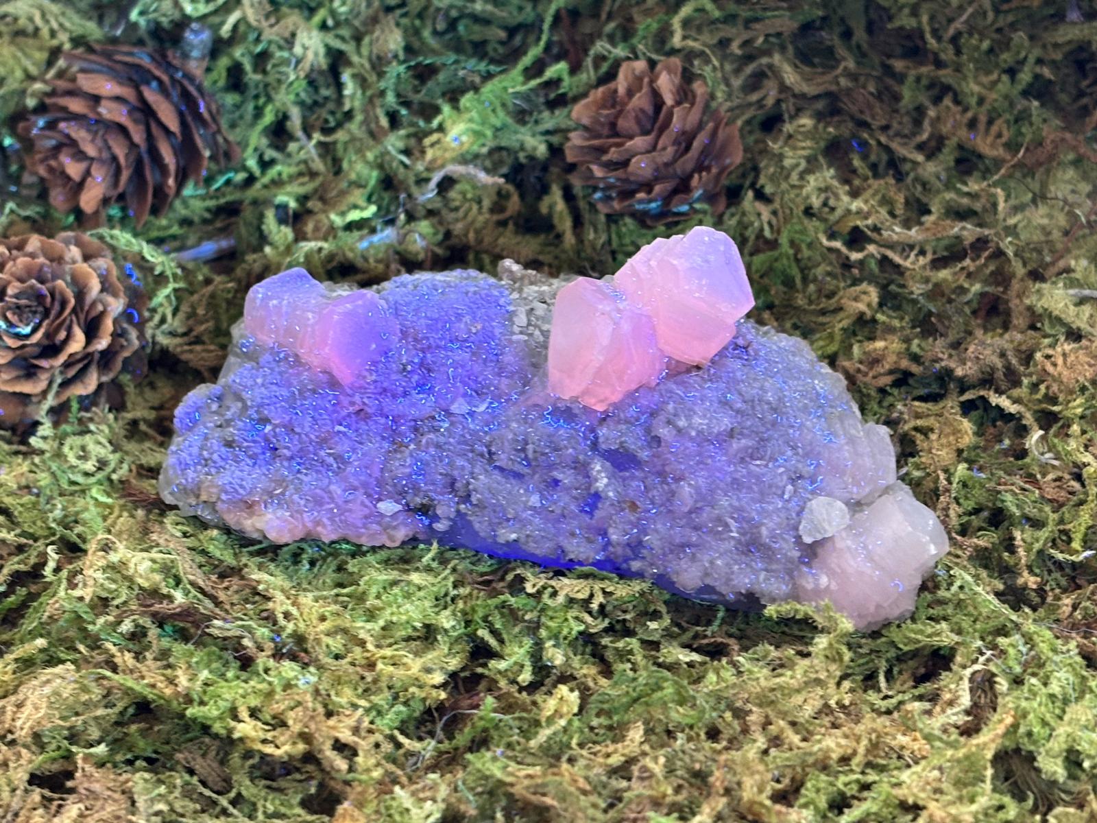 Ces druses sont de véritables trésors alchimiques : elles associent la puissance protectrice de la pyrite, la sagesse cristalline du quartz, l’intuition profonde de la fluorine et la douceur équilibrante de la calcite.