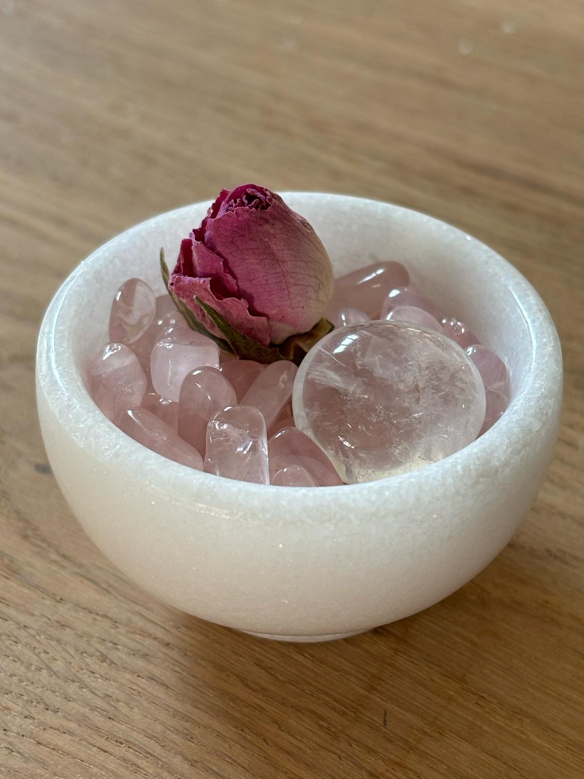Créée avec douceur dans mon atelier de sorcière, cette coupelle est une invitation à la paix intérieure et à l’amour de soi. Le jade blanc, symbole de sérénité et de purification, apporte une sensation de calme et d’équilibre. Les chips de quartz rose, pierre de l’amour inconditionnel, ouvrent le cœur et favorisent une profonde guérison émotionnelle. Le cristal de roche, pierre amplificatrice, purifie l’énergie et clarifie les intentions. Le bouton de rose séché ajoute une touche de tendresse et de beauté, tout en renforçant l’énergie de l’amour et du bien-être.