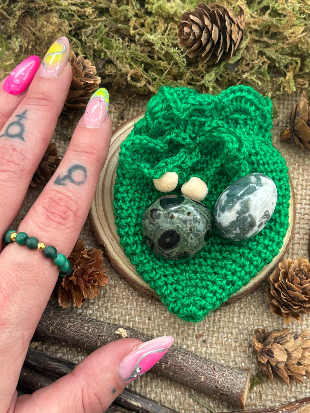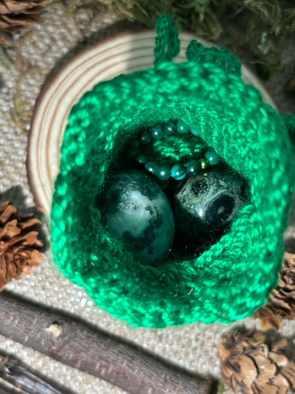 Dans cette petite bourse crochetée avec tendresse par ma maman, se cache l’esprit de la forêt…