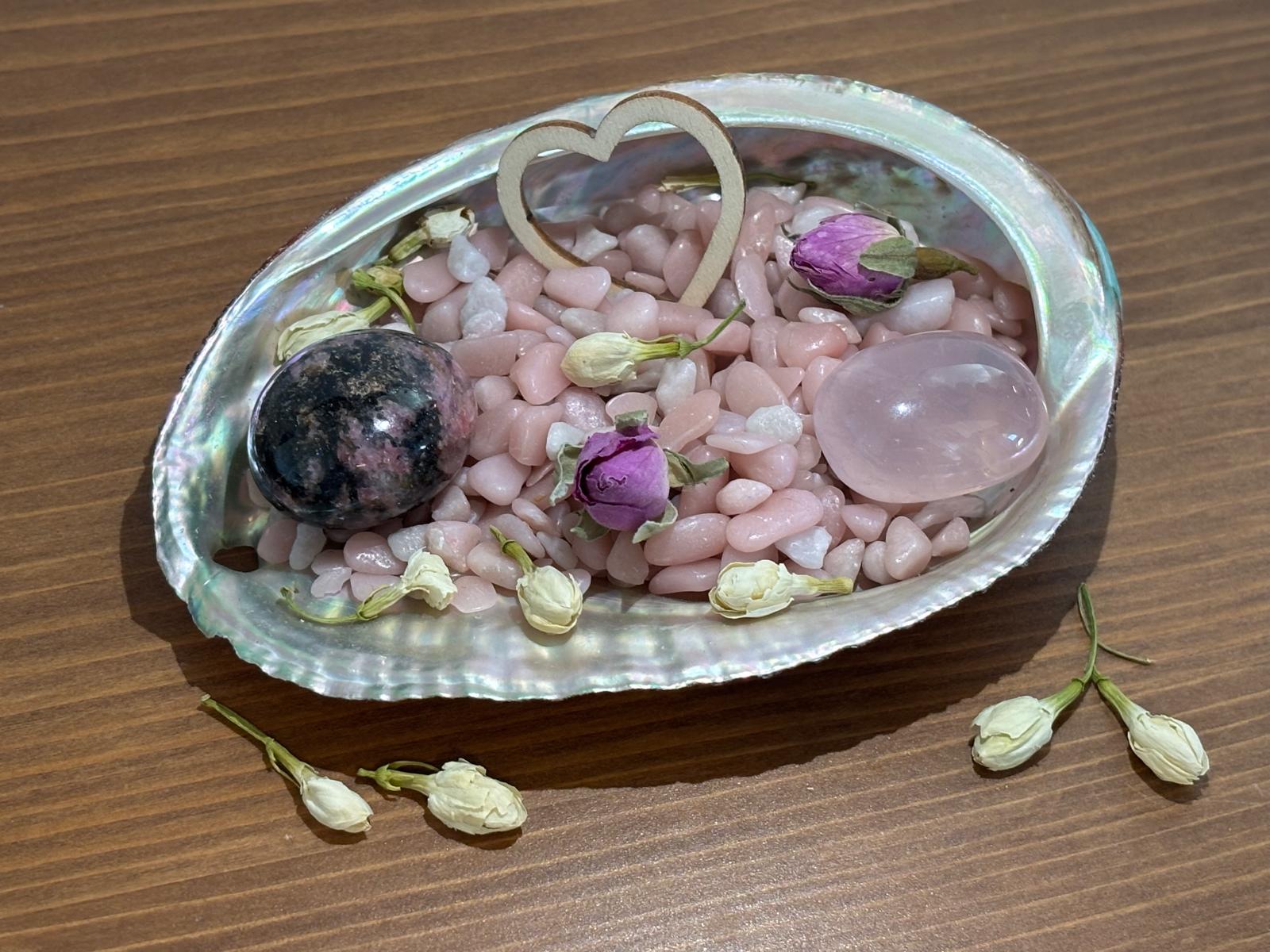 Nichées dans une coquille d’ormeau naturelle, les pierres choisies vibrent en harmonie : l’opale rose apaise et réconforte, la rhodonite guérit les blessures du passé, et le quartz rose ouvre le cœur avec une tendresse infinie. Les boutons de rose séchée et le jasmin diffusent une énergie florale légère, presque chuchotée… Un cœur en bois symbolise l’intention pure qui lie chaque élément.