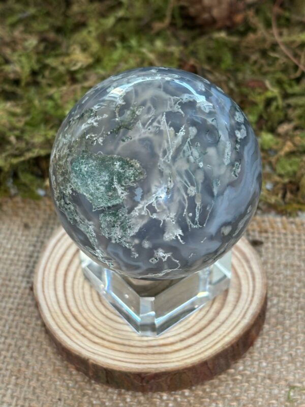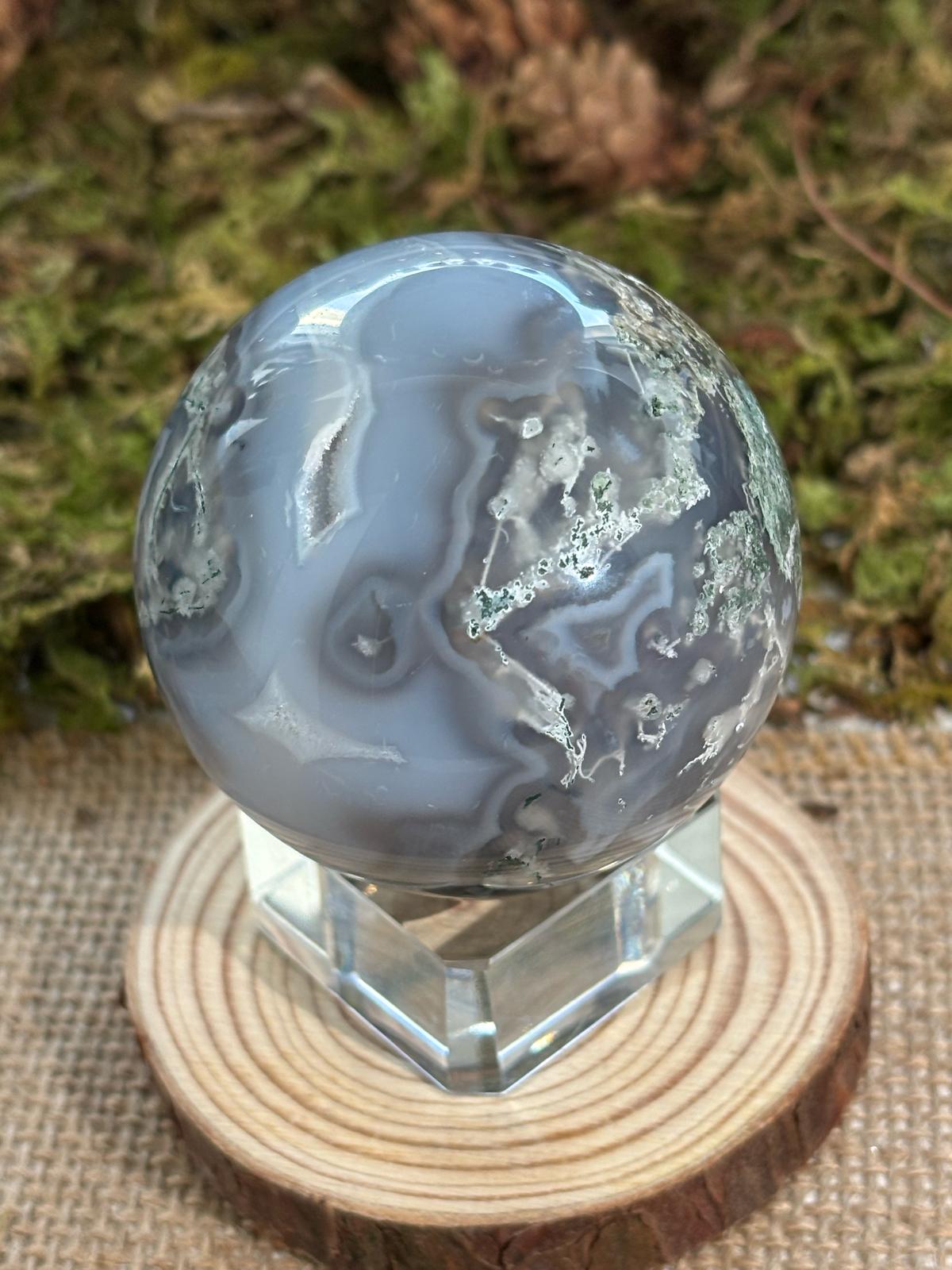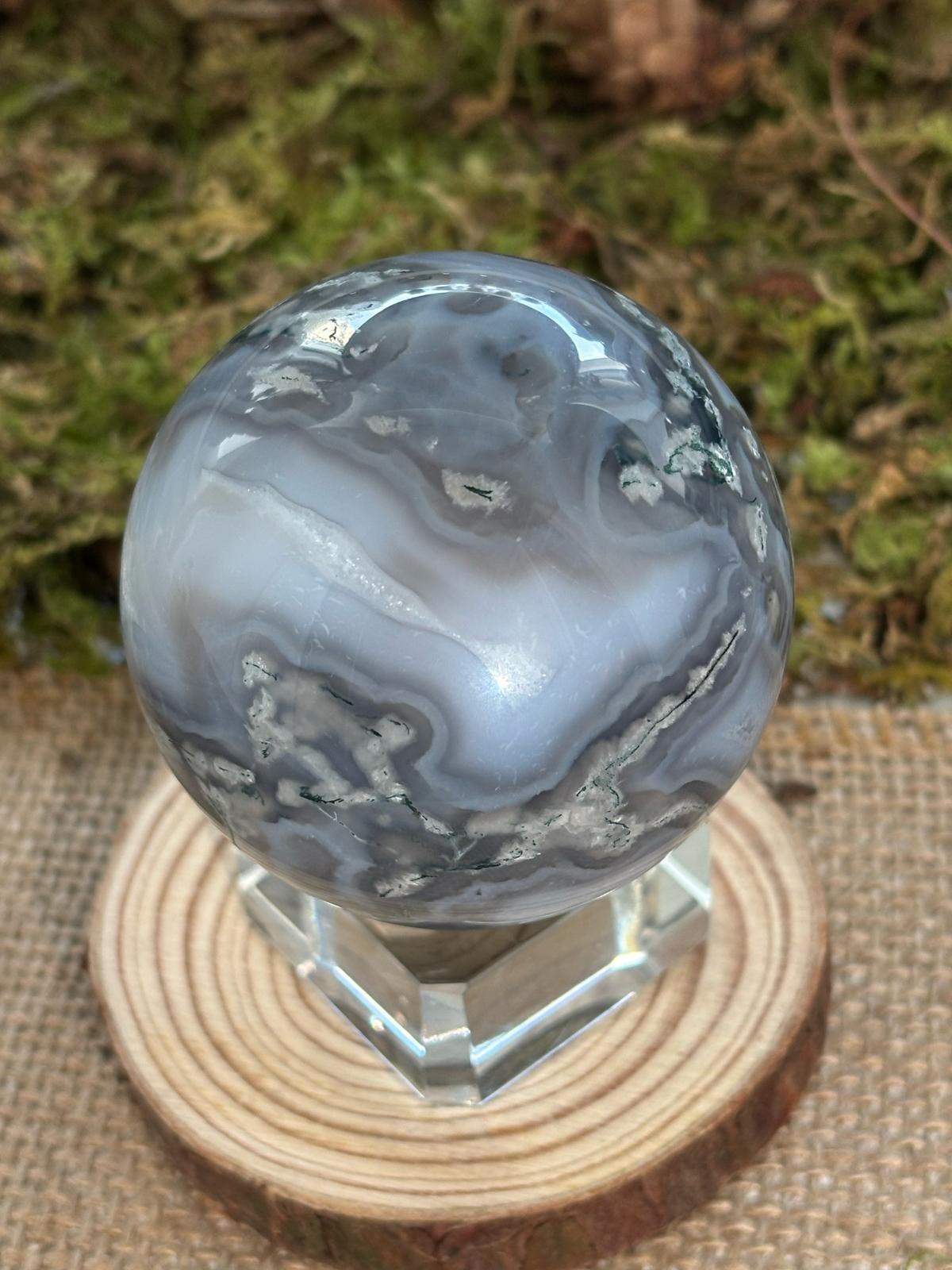 Une magnifique sphère où les motifs organiques de l’agate mousse se parent de subtiles teintes bleutées, évoquant un paysage brumeux ou un reflet aquatique. De fines inclusions de quartz viennent illuminer la pierre, ajoutant une touche de profondeur et de mystère. 💎🌿