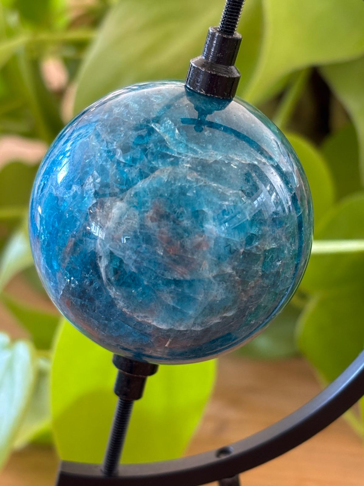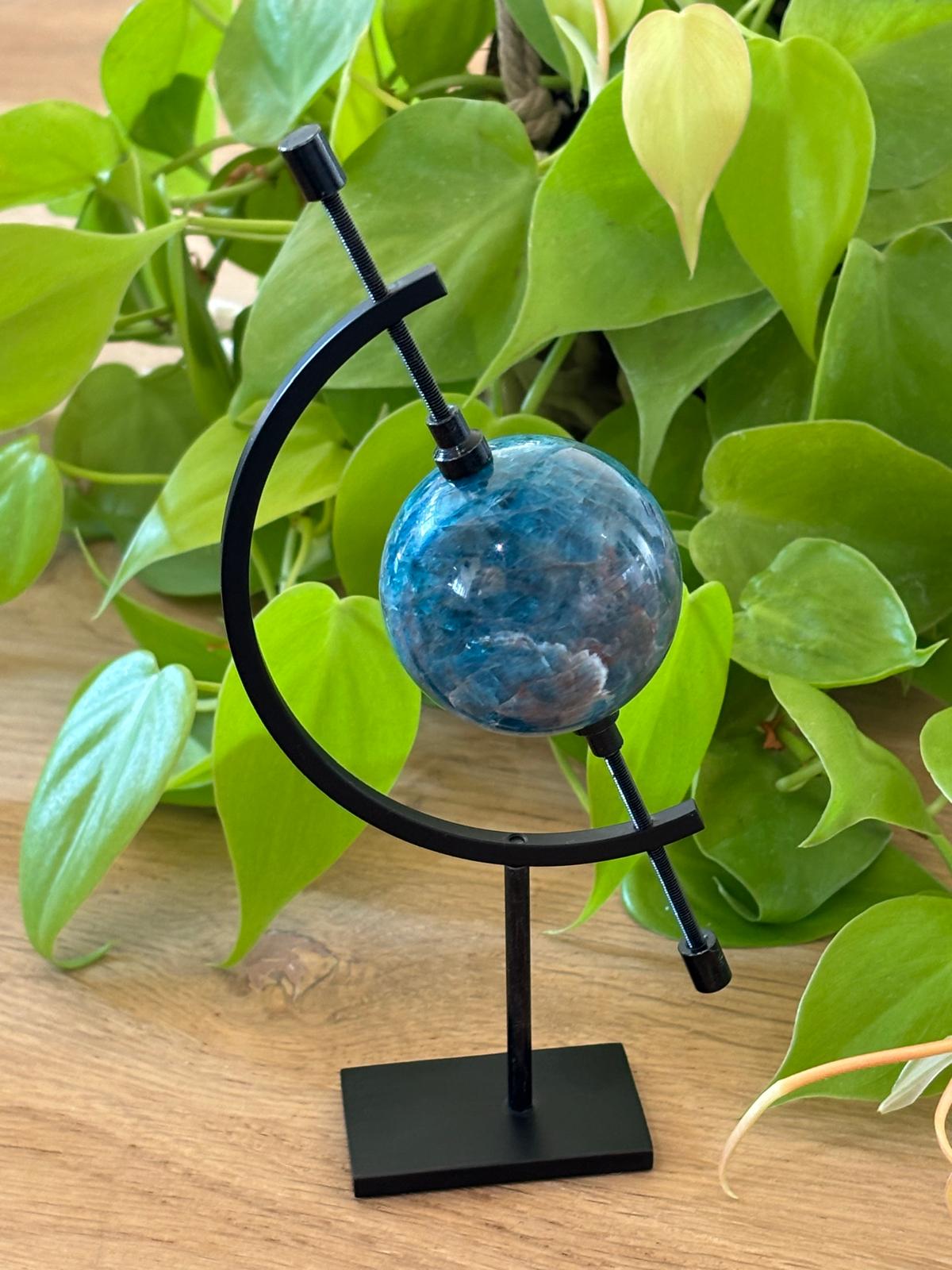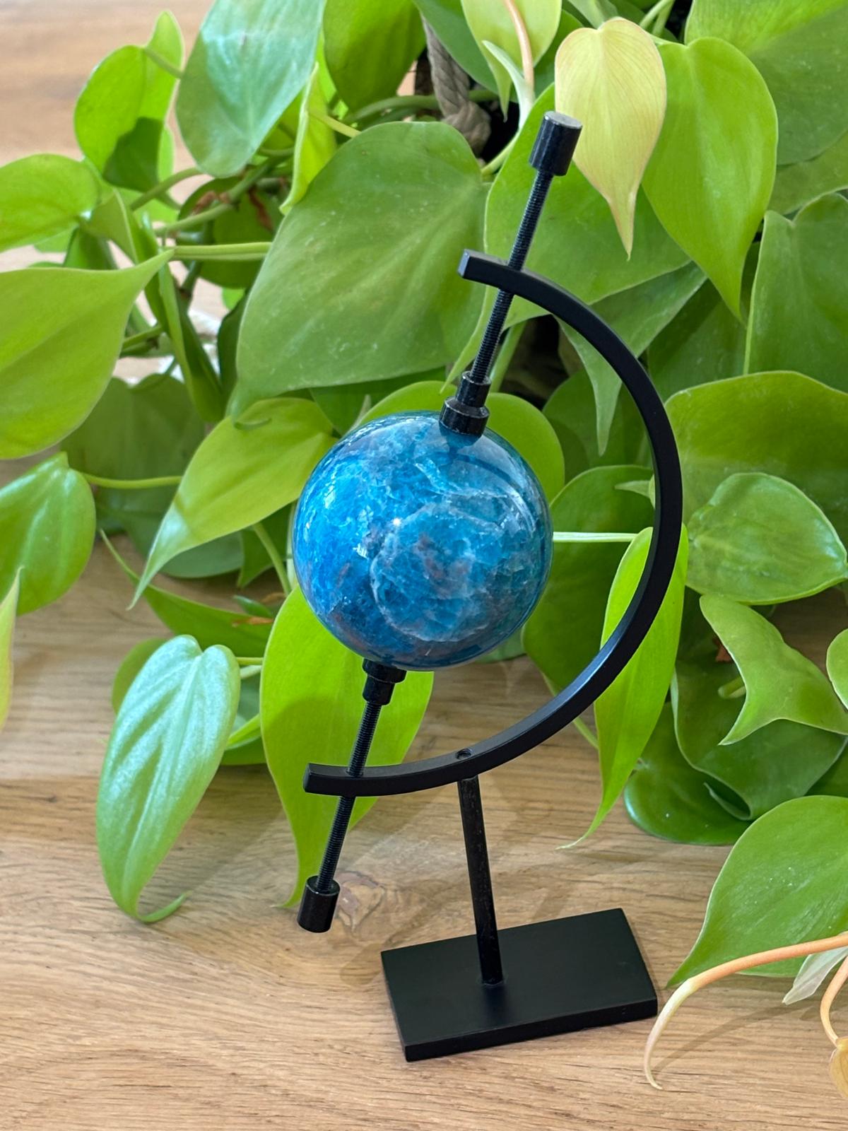 Invitation à l’évasion, cette sphère en apatite bleue évoque un petit bout d’univers, posé sur son élégant support. Idéale pour harmoniser l’espace et inspirer la clarté d’esprit 🌍✨