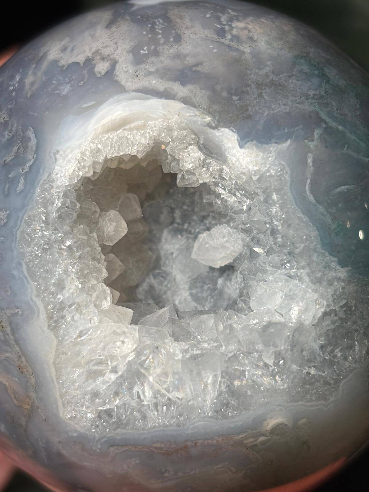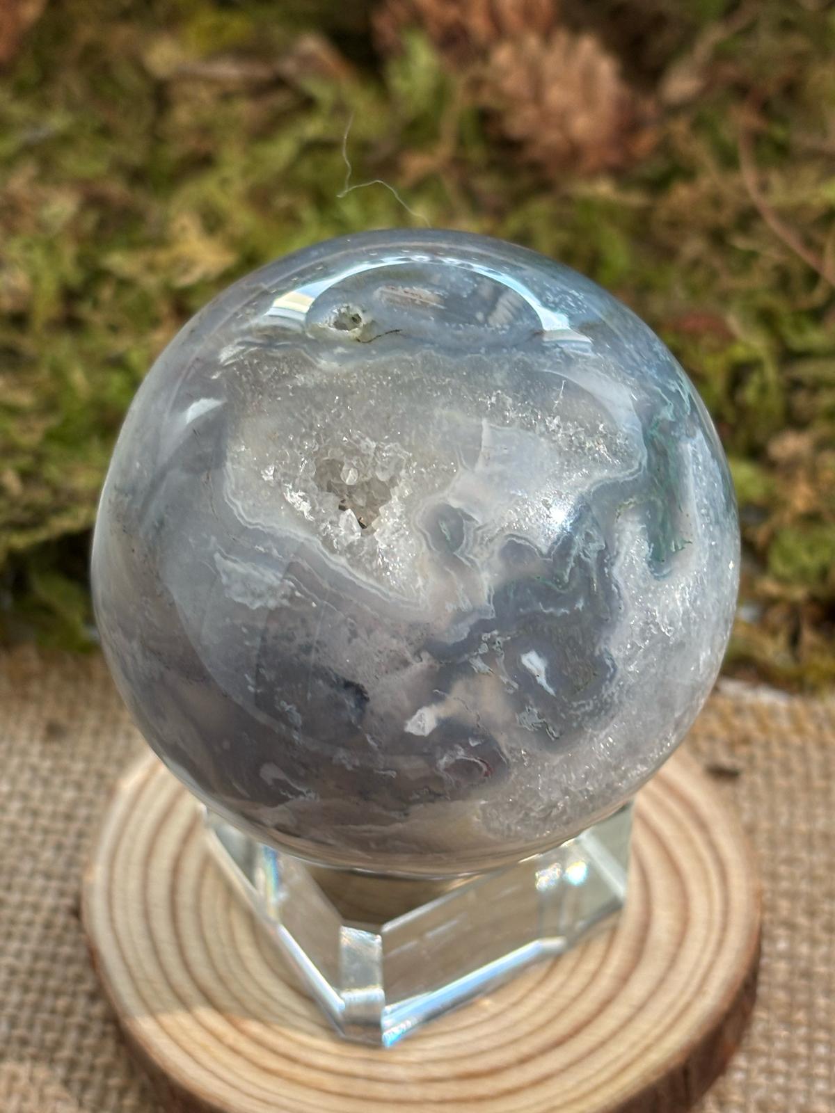 ✨ Un bijou naturel où la magie minérale prend vie. Cette magnifique sphère d’agate mousse dévoile un jeu subtil de teintes bleutées, violettes et vertes, formant un paysage brumeux captivant. Son atout rare ? Un druzy de quartz scintillant, véritable petite caverne cristalline qui capte la lumière et ajoute une touche de féerie.