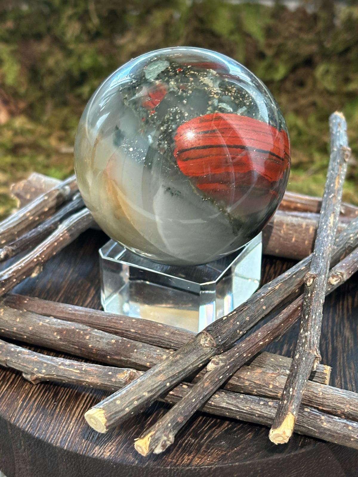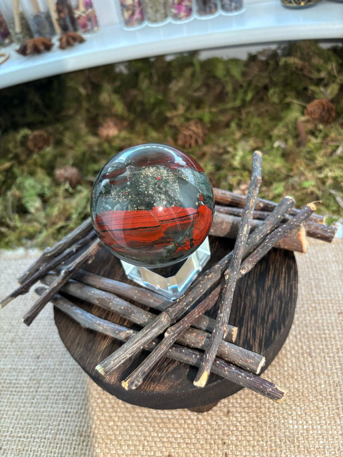 🔥 Une sphère intense et contrastée : le jaspe héliotrope, dans ses teintes sombres et mystérieuses, est traversé par des éclats rouges flamboyants. Sa particularité rare ? De subtiles inclusions de pyrite scintillante, une combinaison peu commune qui en fait une pièce unique et recherchée. Véritable fusion entre feu et métal, elle capte la lumière et attire le regard. 💎🖤
