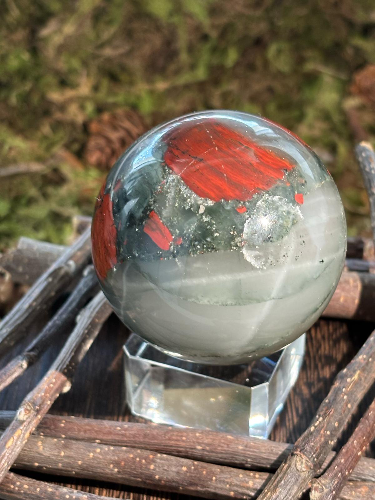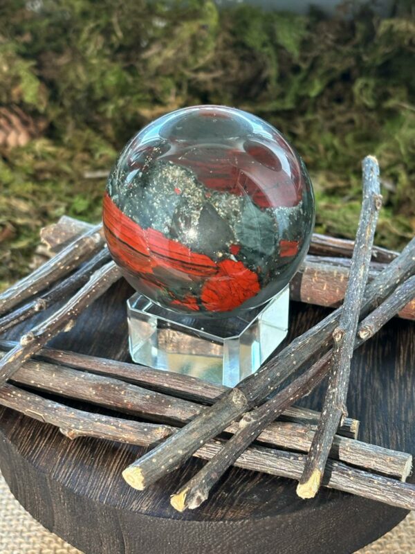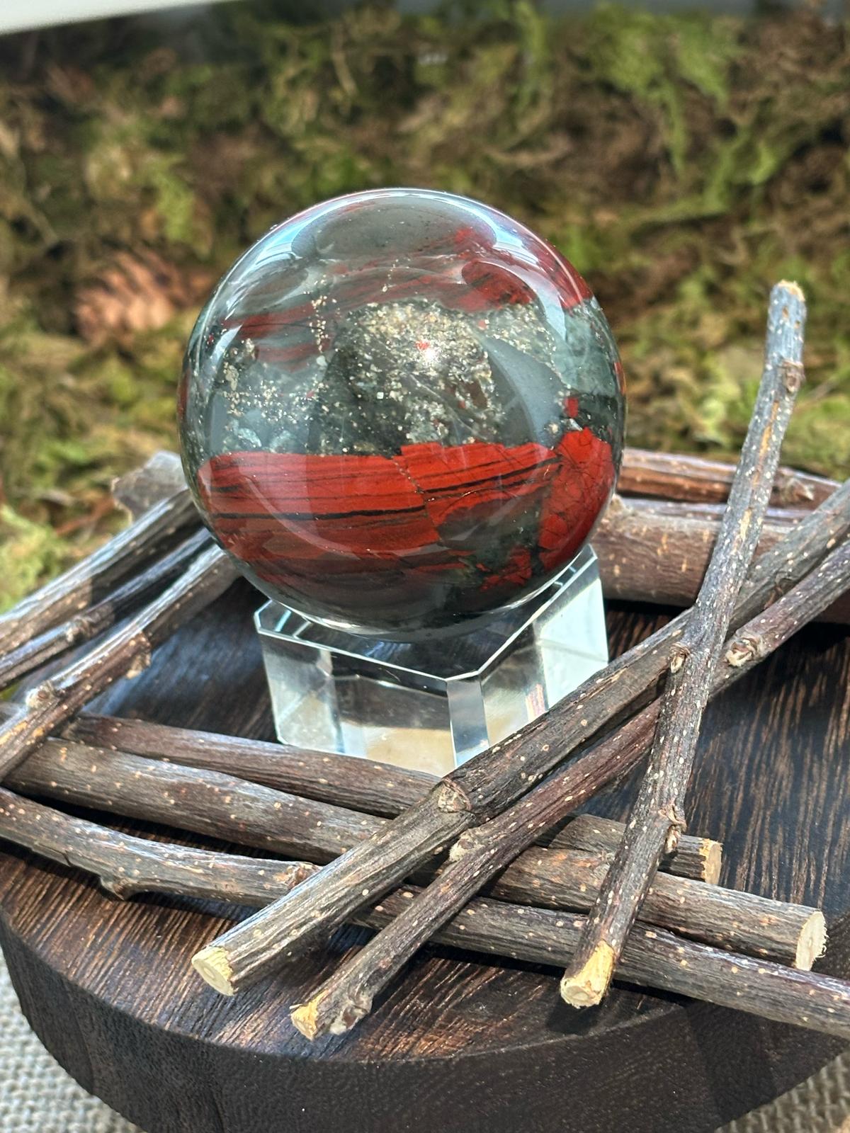 Sphère en Jaspe Héliotrope (Jaspe Sanguin/ African Blood) & Pyrite + Support