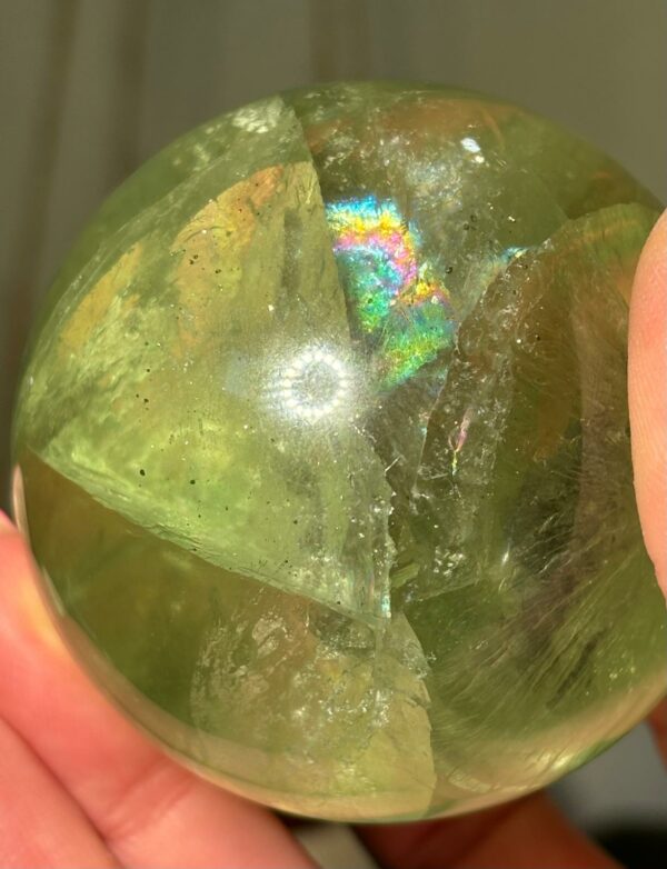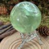 Cette sphère en fluorine verte, à la douce teinte de pomme fraîche, est une vraie petite merveille de la nature. D’une qualité exceptionnelle, elle présente une belle transparence cristalline et de superbes inclusions qui capturent la lumière… jusqu’à dévoiler de magnifiques arcs-en-ciel internes, comme des éclats de magie figés dans la pierre. Et comme si cela ne suffisait pas, elle est réactive aux UV, révélant alors une fluorescence bleutée intense et envoûtante.