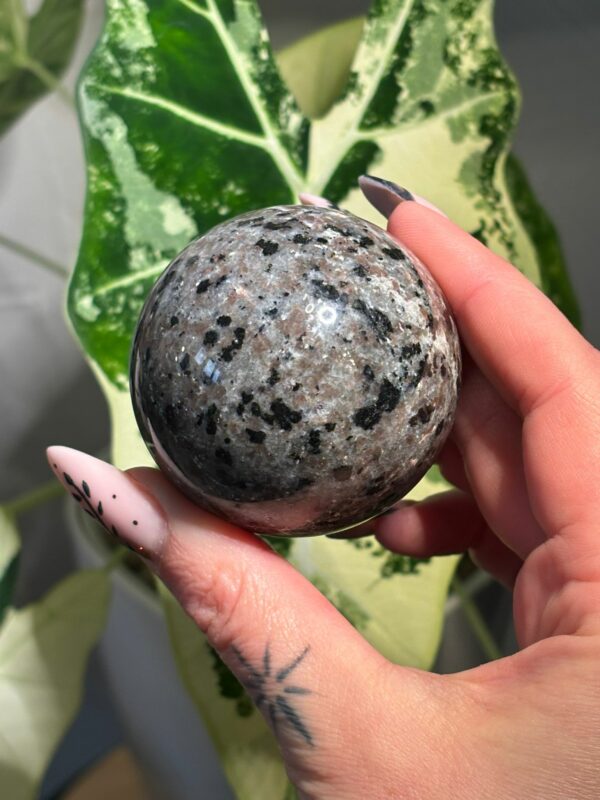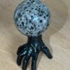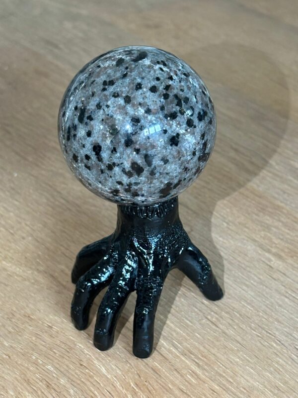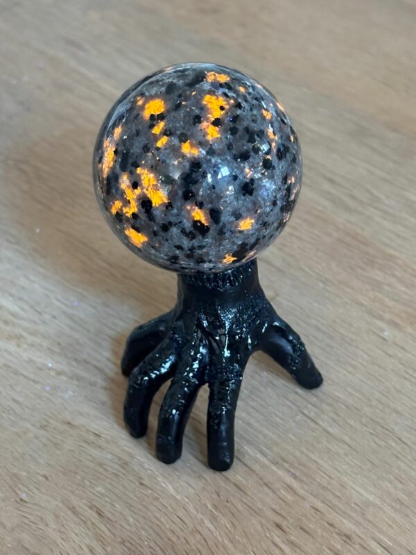 Sous lumière naturelle, cette sphère en yooperlite dévoile son aspect minéral gris tacheté. Mais dès qu’on allume la lumière UV, elle s’embrase de reflets orangés incandescents, comme si des braises s’étaient réveillées à l’intérieur 🔥. Une pièce originale et fascinante, posée sur son support “La Chose”, la célèbre main de la Famille Addams, parfaite pour la collection Halloween.